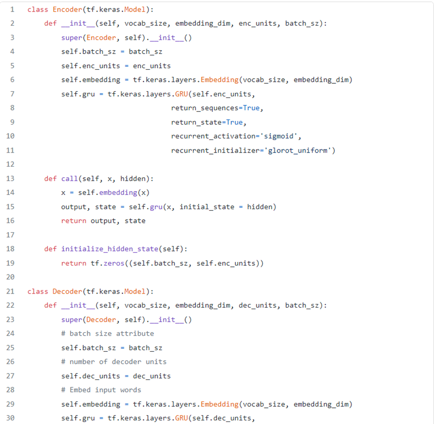 在下个单元中,将定义编码器和解码器架构。默认情况下,编码器和解码器配置在CPU上运行。然而,模型在基于CUDA的GPU上运行要快得多。如果在GPU上进行训练,应将第 7行至 27行代码替换为: