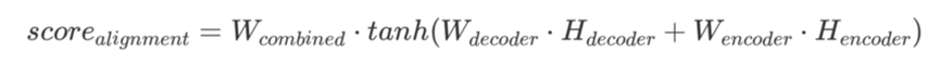 可以将Bahdanau注意力机制划分为以下步骤:首先,将上一个时间步长中的解码器隐含态与编码器隐含态(输入句子中的每个元素对应一个隐含态)相组合,生成对齐分值。类似于Vaswani注意力机制中的sqrt(d),Bahdanau注意力机制采用Tanh作为缩放因子,可以用下面的公式来表示: