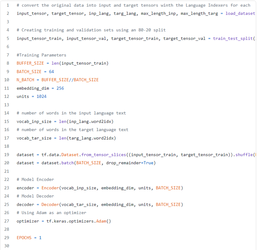 最后,序列到序列翻译模型的所有片段均准备好之后,只需运行以下代码段,实例化数据集并开始训练模型。