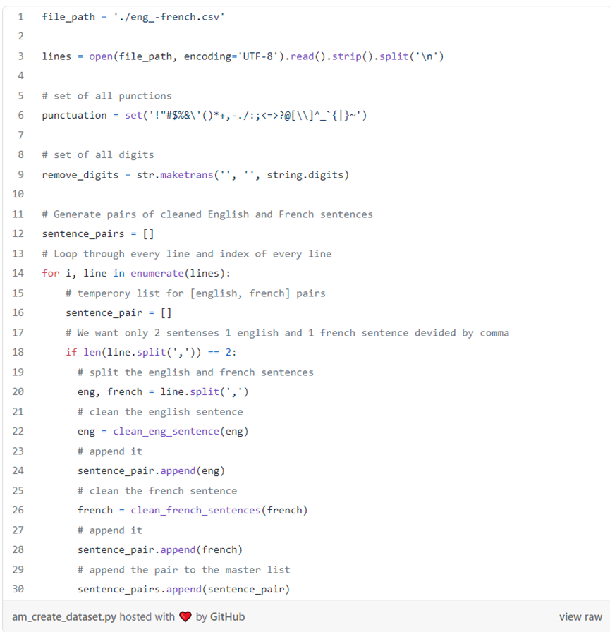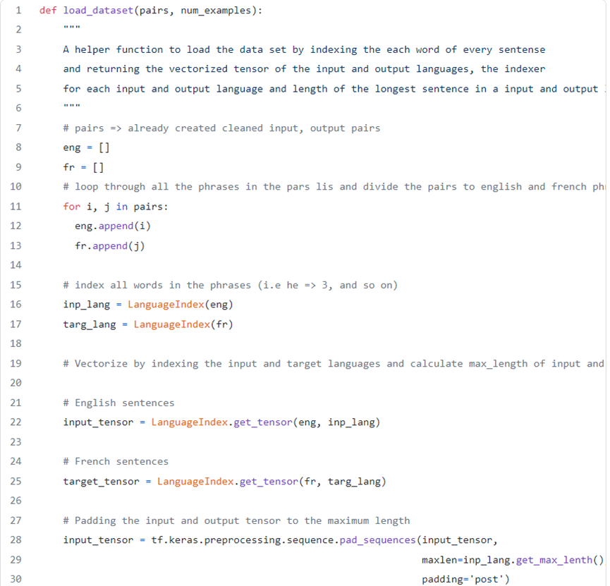 5. 把上述内容归集起来。清理输入数据、向量化输入和输出语言的张量、计算输入和输出句子的最大长度,并添加必要的填充。这些操作通过下述代码来实现。