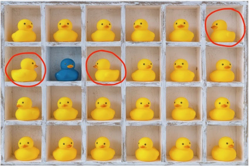 看到这张照片时,首先映入眼帘的是什么?相信大多数人的眼神会被蓝色小鸭子吸引。对人类而言,显然这只蓝色小鸭子在图片中异常突出。不知何故,人类总是具备发现特定模式的能力,并会将注意力转移到那些与众不同的特征之上。