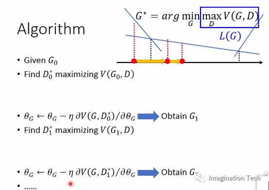 有了G1后,我们再次重复上面的最大化V的过程,得到D1,然后再次运用梯度下降,得到G2,如此循环下去,可以期待,Pg将会越来越接近Pd。