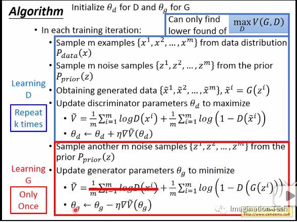 仔细观察上式,最大化V的过程,就是将Pd产生的样本作为正样本,Pg产生的样本作为负样本,训练一个分类器D的过程。