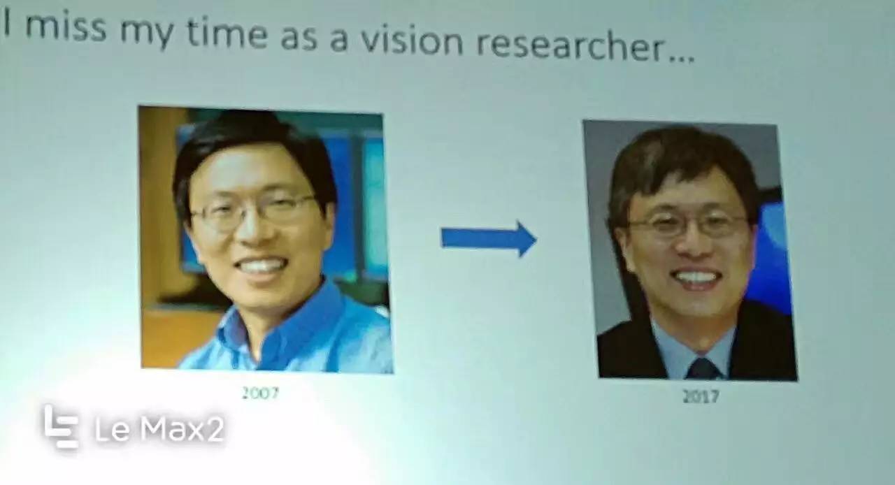 沈向洋(微软执行副总裁)在IJCV Asia Lobster Night的演讲中,提到了他离开视觉研究整10年。岁月催人老,不做视觉让他容颜发生了很大的变化。因而,他实在怀念做视觉的美好时光。后来,罗杰波和“吴门视觉派”(吴郢和他的学生们)在朋友圈纷纷晒出了不少“容颜vs时间”的变化图来作佐证。