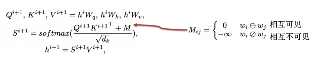 有了可见矩阵以后,可见矩阵该如何使用呢?其实很简单,就是 Mask-Transformer。对于一个可见矩阵 M,相互可见的红色点取值为 0,相互不可见的白色取值为负无穷,然后把 M 加到计算 self-attention 的 softmax 函数里就好,即如下公式。