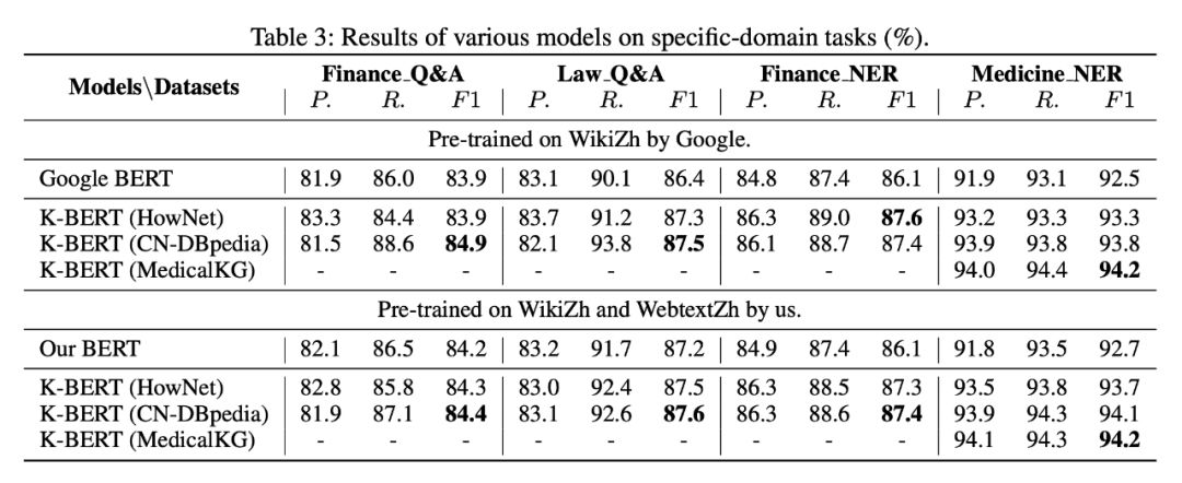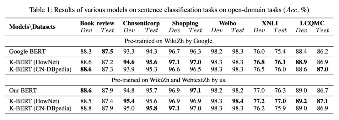 可以看出,K-BERT 相比于 Google BERT,在开放领域的任务上有一点微小的提升,但是提升不是很明显。可能的原因在于开放领域的任务并不需要背景知识。