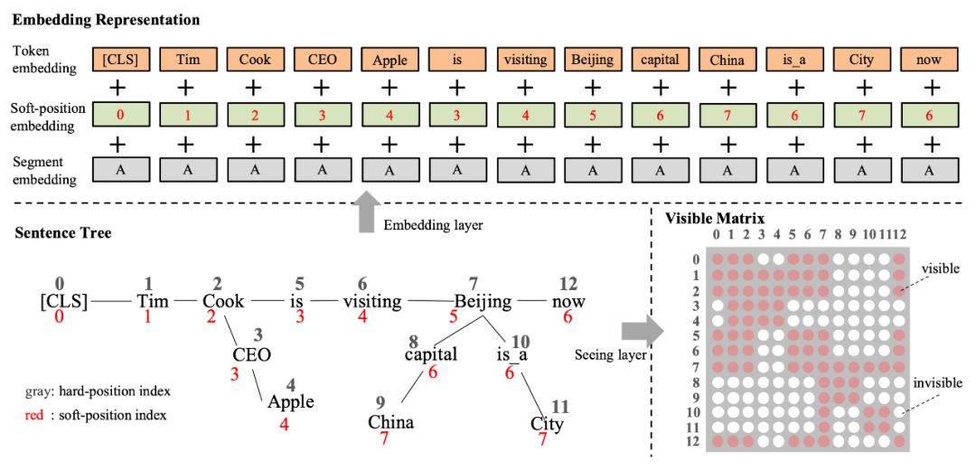 ▲ 图6. 句子树转化为Embedding representation和可见矩阵