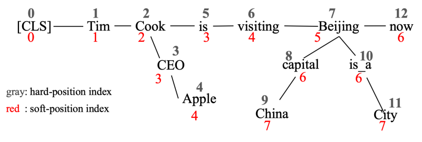 显然,平铺以后的句子是杂乱不易读的,K-BERT 通过软位置编码恢复句子树的顺序信息,即“[CLS](0) Tim(1) Cook(2) CEO(3) Apple(4) is(3) visiting(4) Beijing(5) capital(6) China(7) is_a(6) City(7) now(6)”,可以看到“CEO(3)”和“is(3)”的位置编码都 3,因为它们都是跟在“Cook(2)”之后。