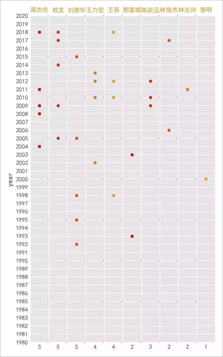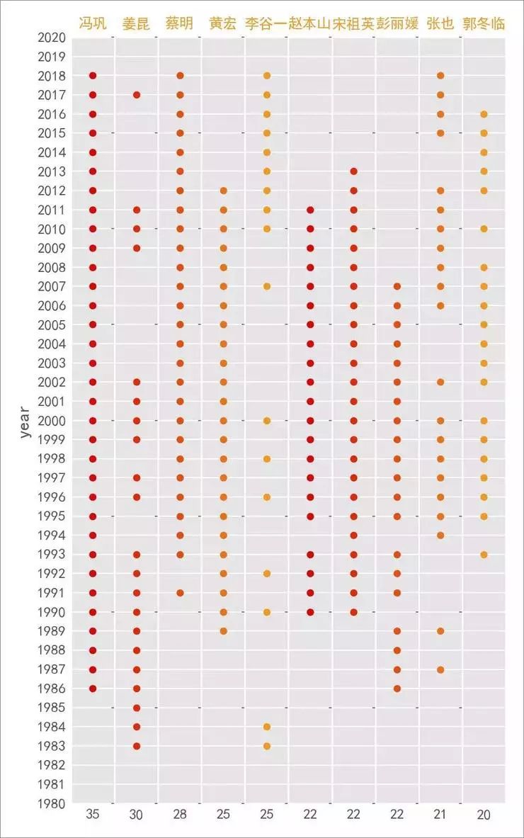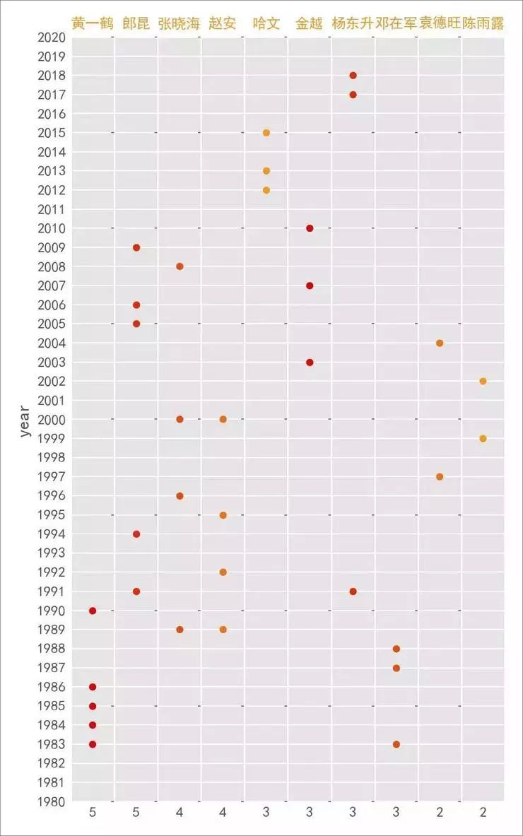 部分演员表演次数和图中点数不一致,是因为某些年 TA 不只表演了一个节目