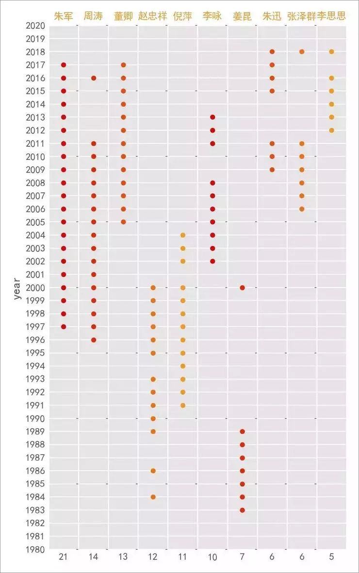 排第一的是 主持了 21 年的朱军,称得上劳模了,从 1997 年连续不间断地住持到 2017 年,远超其他主持人。