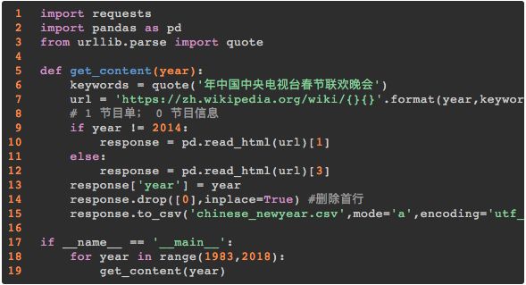 Python 抓取这类表格数据,方法简单,几行代码就能搞定,修改 URL 的 page 参数,可以循环遍历抓取 1983 到 2018 年所有的节目数据。