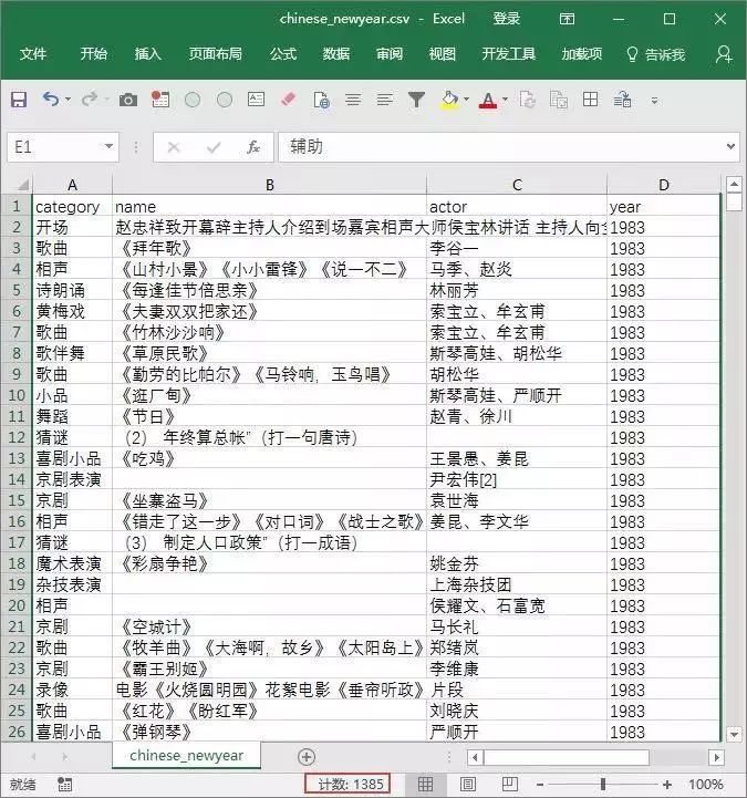 网上搜了挺久都没有找到齐全的春晚节目数据,连春晚官网也没有,结果在维基百科上找到了。