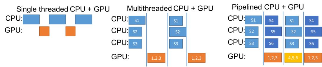 在强化学习中优化异质网络集群的调度。蓝色框是模拟器,如 Atari 游戏模拟器或 MuJoCo 物理引擎,它们的 episode 长度不同。使用 GPU 的普通方式(左)性能较差,原因有二:1)GPU 的批大小无法利用其并行计算能力;2)GPU 等待 CPU 时的空闲时间,反之亦然。多线程方法(中)通过使多个 CPU 并行运行模拟器实现 GPU 的更高效使用,但是这导致 GPU 在 CPU 运行时处于空闲状态,反之亦然。Uber 提出的流水线型实现(右)允许 GPU 和 CPU 都高效运行。该方法还可以同时运行多个 GPU 和 CPU,这已经应用于实践中。
