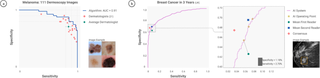 DL在皮肤科的主要临床任务包括病变特异性鉴别诊断,在许多良性病变中发现病变,并帮助跟踪病变随时间的增长。一系列的研究表明,CNNs在从良性皮肤病变中分类恶性皮肤病变方面可以与认证皮肤科医生的表现相匹配。这些研究相继测试了越来越多的皮肤科医生(25-7 57-93,157-94),一致表明分类的敏感性和特异性匹配甚至超过医生水平。这些研究很大程度上局限于区分良性和恶性皮肤病变的二元分类任务,将黑素瘤与痣或脂溢性角化癌进行分类。
