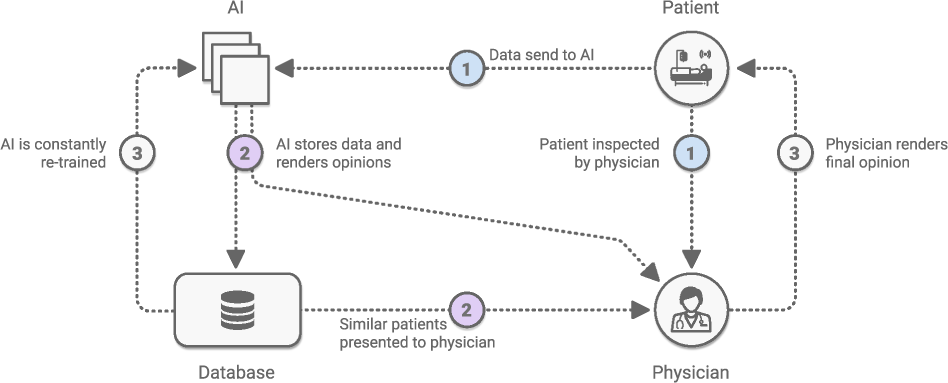 这些技术很大程度上依赖于监督学习,它利用包含数据点(如图像)和数据标签(如对象类)的数据集。考虑到医学数据的稀疏性和访问困难,迁移学习——算法首先在一个大型且不相关的语料库(如ImageNet4)上进行训练,然后在感兴趣的数据集(如医学)上进行微调——对进展至关重要。为了减少与收集和标记数据有关的费用,正在开发生成合成数据的技术,例如数据增加和生成式对抗网络。研究人员甚至表明,众包图像注释可以产生有效的医学算法。最近,自监督学习——从数据点中提取隐式标签并用于训练算法(例如,预测由分割图像生成的瓦片的空间排列)——已经将该领域推向了完全的无监督学习,这种学习不需要标签。将这些技术应用于医学将减少开发和应用的障碍。