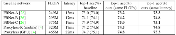虽然表 4 展示了本文方法的优越性,但是由于搜索空间和训练方法的不同,存在不公平对比的可能性。为直接进行对比,本文采用和 Proxyless NAS、FBNet相同的搜索空间,并在同一设置下再训练已搜索的模型,具体对比结果如表 5 所示: