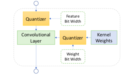 混合精度量化搜索。选择单元可以搜索卷积层权重和特征的量化精度。在超网络训练中,特征图的位宽和和权重被随机选取。详见下图。