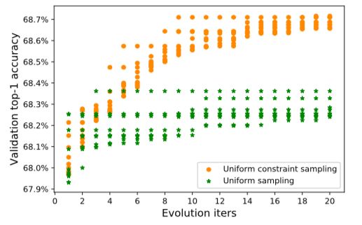 先验分布很重要。旷视研究员通过实验发现,均匀采样已经足够好。这并不让人惊讶。这是因为实际任务常常期望有多个模型结构,以满足不同的约束。图 2 表明,两个采样方法皆工作良好,均匀约束采样方法表现稍好,本文默认使用它。