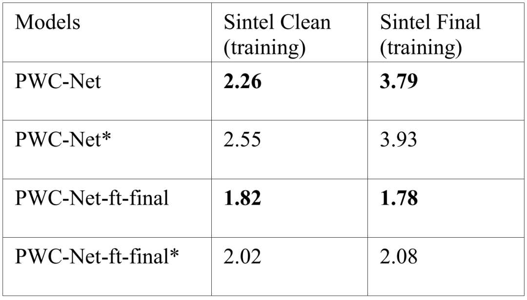 对于PWC-Net 方法,同样,不论是预训练模型还是 Fine-tune 模型,其结果都优于论文发布结果(*)。