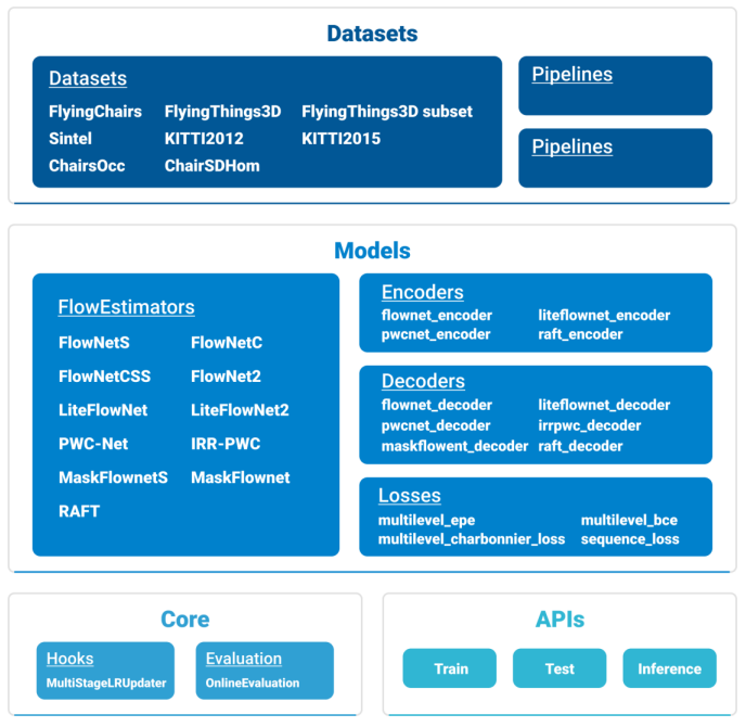 MMFlow 主要由 4 个部分组成:datasets、models、core 和 apis。datasets 用于数据集加载和预处理,其中包含训练所需的数据集,光流数据增广的pipelines,和加载数据时的 samplers。models是最关键的部分,光流模型在这里实现。