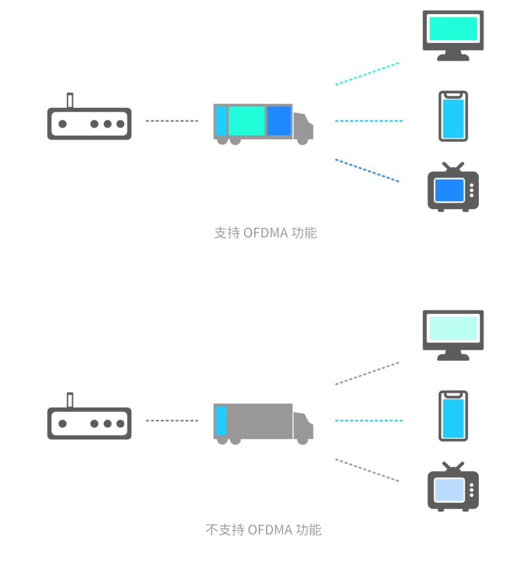 OFDMA 功能也可以打个形象的比方:物流中心给某个客户发货的时候,发现卡车没填满,老的调度系统(Wi-Fi 5)会选择直接发货,然后再给下一个客户发货,下一个客户同样没填满卡车,依次往复;而新的调度系统(Wi-Fi 6)会尝试填满整个卡车,这个卡车会一次性把所有的货物发给每个不同的客户。OFDMA 技术可以帮助设备访问互联网时大幅度减少延迟,提高传输效率。