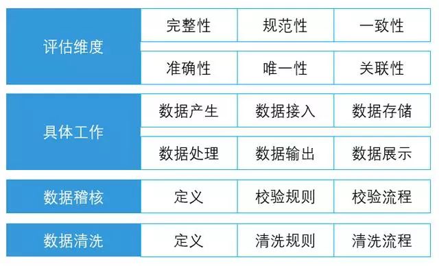 制度和规范。从技术层面上,应该完整全面的定义数据质量的评估维度,包括完整性、时效性等,按照已定义的维度,在系统建设的各个阶段都应该根据标准进行数据质量检测和规范,及时进行治理,避免事后的清洗工作。