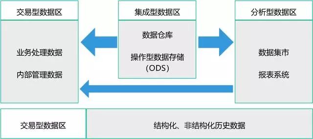 2)集成型数据区。集成型数据区包括操作型数据(OLTP)和数据仓库型数据(OLAP)。