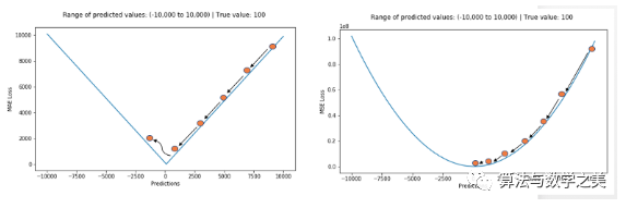 每当我们训练机器学习模型时,我们的目标就是找到最小化损失函数的点。当然,当预测值正好等于真实值时,这两个损失函数都达到最小值。