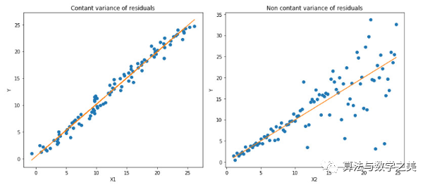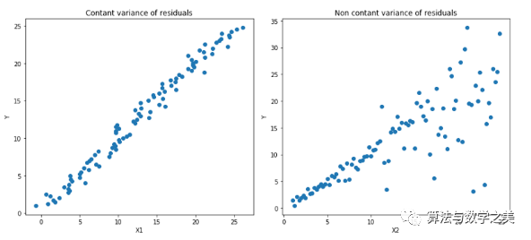 左:线性关系b/w X1和Y,残差的方差恒定。右:线性关系b/w X2和Y,但Y的方差随着X2增加而变大(异方差)。