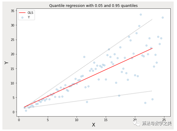 Quantile回归:虚线表示基于0.05和0.95 分位数损失函数的回归估计