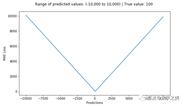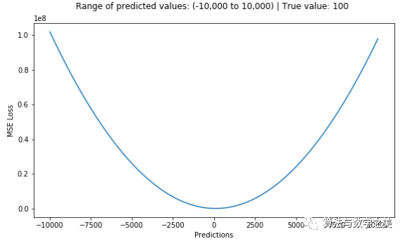下面是一个MSE函数的图,其中真实目标值为100,预测值在-10,000至10,000之间。预测值(X轴)= 100时,MSE损失(Y轴)达到其最小值。损失范围为0至∞。