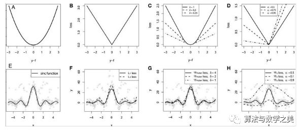连续损失函数:(A)MSE损失函数; (B)MAE损失函数; (C)Huber损失函数; (D)Quantile损失函数。用有噪声的sinc(x)数据来拟合平滑GBM的示例:(E)原始sinc(x)函数; (F)以MSE和MAE为损失拟合的平滑GBM; (G)以Huber Loss拟合的平滑GBM, = {4,2,1}; (H)以Quantile Loss拟合的平滑GBM。