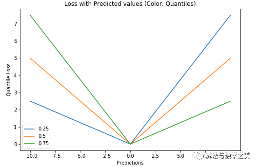 Quantile Loss(Y轴)与预测值(X轴)关系图。真值为Y= 0