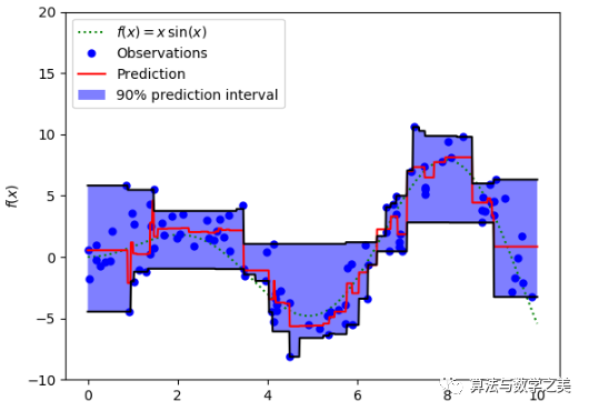 上图显示的是sklearn库的GradientBoostingRegression中的quantile loss函数计算的90%预测区间。上限的计算使用了γ = 0.95,下限则是使用了γ = 0.05。