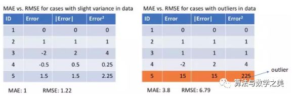 让我们来看看两个例子的MAE值和RMSE值(RMSE,Root Mean Square Error,均方根误差,它只是MSE的平方根,使其与MAE的数值范围相同)。在第一个例子中,预测值接近真实值,观测值之间误差的方差较小。第二个例子中,有一个异常观测值,误差很高。