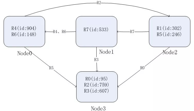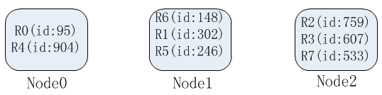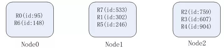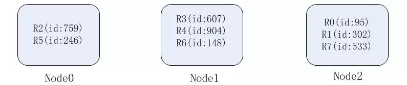 我们选择id作为数据分片的key,那么各个节点负责的数据如下: