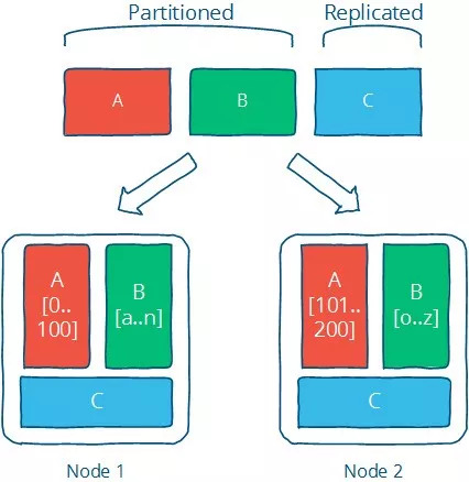 其中数据A、B即属于数据分片,原始数据被拆分成两个正交子集分布在两个节点上。而数据集C属于数据冗余,同一份完整的数据在两个节点都有存储。当然,在实际的分布式系统中,数据分片和数据冗余一般都是共存的。