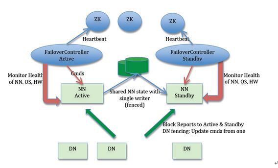 上图中NN即NameNode,DN即DataNode(即实际存储数据的节点)。从图中可以看到,两台NameNode形成互备,一台处于Active状态,为主NameNode;另外一台处于Standby状态,为备NameNode,只有主NameNode才能对外提供读写服务。