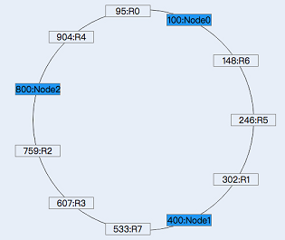 这里仍然以上述的数据为例,假设id的范围为[0,1000],N0、N1、N2在环上的位置分别是100、400、800,那么hash环示意图与数据的分布如下: