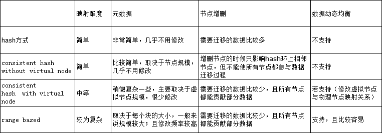 在这里对三种分片方式(应该是四种,有没有virtual node的一致性hash算两种)进行简单总结,主要是针对提出的几个问题:
