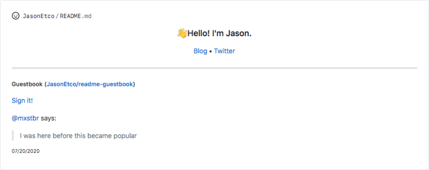 我的好友 @JasonEtco[9] 一直在尽 Action 所能来推广 GitHub 和 Action,这次他用 Action 在 GitHub 简介做了一个留言簿。等着你们的点击、浏览、留言三连击,这样我们就功德圆满了哟~