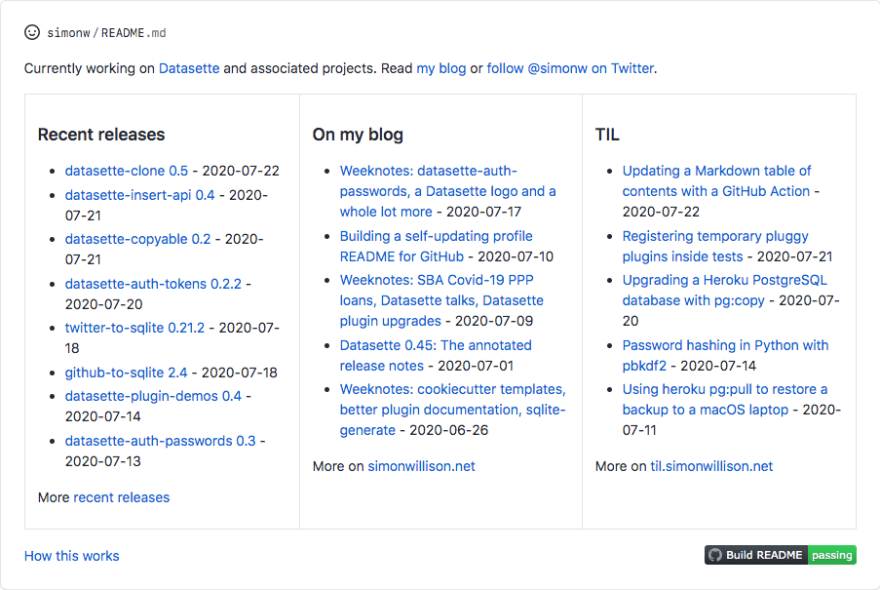 @simonw[18] 的简介可以用 GitHub Action 进行自我更新,包括最近 release 信息、博文、学到的玩意。如果你对这个 README 的实现原理有兴趣,可以阅读下 Simon 发布的这篇博文[19] 。