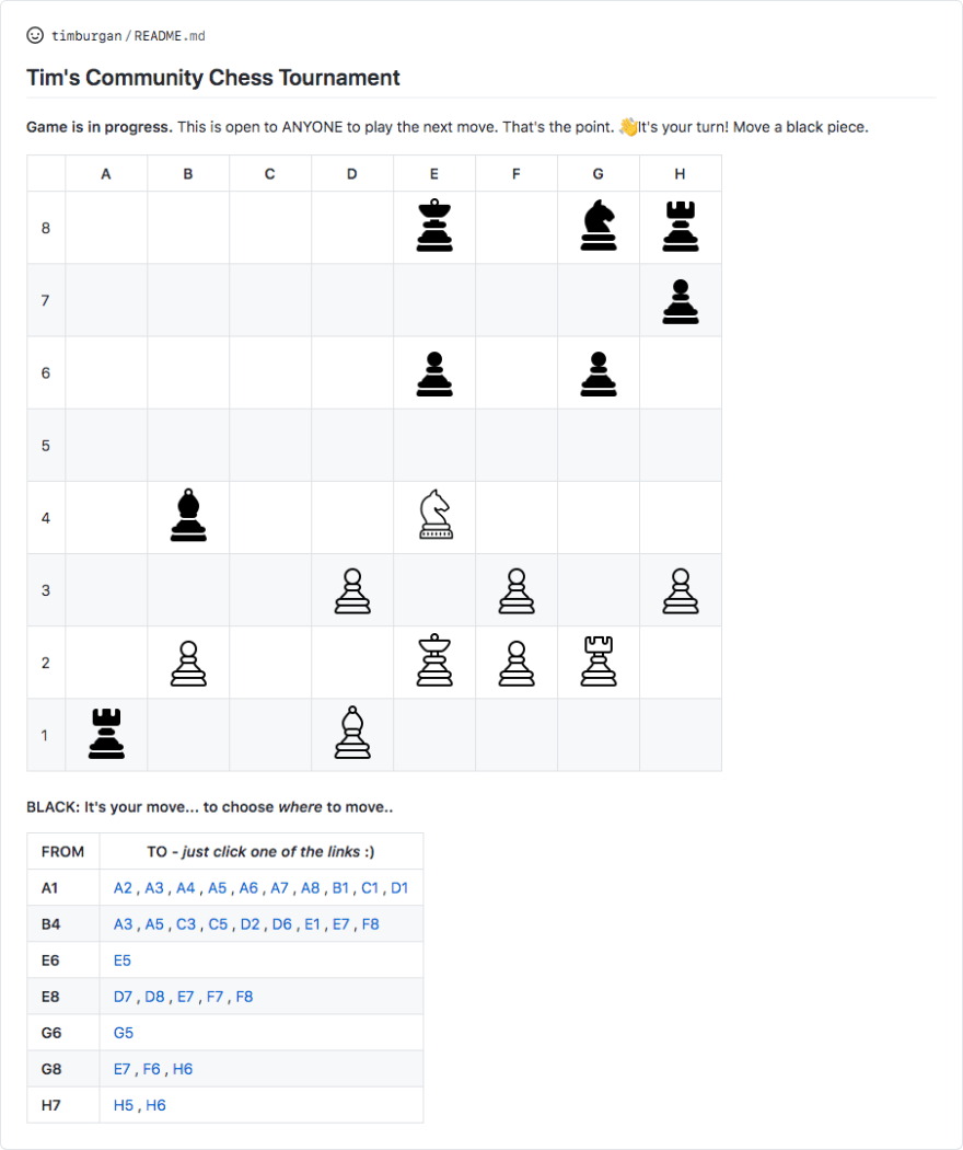 没错!@timburgan[12] 做的这款小游戏可以让你在 GitHub 简介里下象棋。只要单击链接去创建一个带有移动棋子命令的 issue ,剩下的事情 GitHub Actions 工作流会处理。