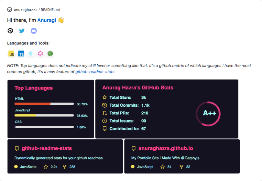 之前在别的地方我可能聊过这个事情,如果你要用 GitHub 作为你的简历或者是作品集,那么 @anuraghazra[7] 做的这个精致小玩意可以很好地帮你展示 GitHub 统计信息。直接在你的仓库中启用 anuraghazra 开源的 github-readme-stats[8] 就好。