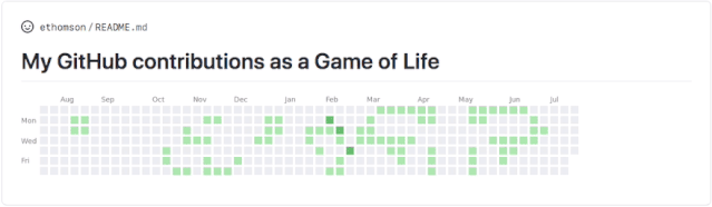 在后台它用了 contributions[14] 库(可用 GitHub 贡献图构造数据结构的库)和 dat-life[15] 库(可用于实现 Conway's Game of Life 的库)。更多详情参见 这里[16].