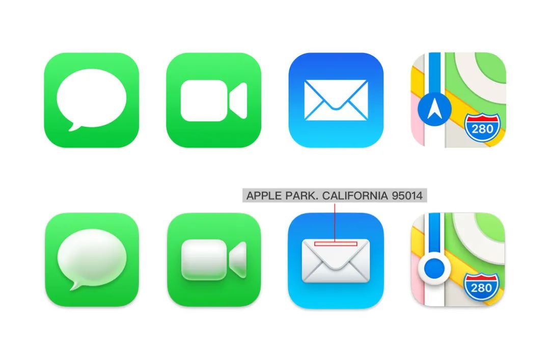 说是类似,因为 Big Sur 和 iOS 目前的图标风格确实有一些不一样。几乎一致的圆角矩形,但 iOS 14 的图标风格是完全的扁平化,而 Big Sur 的图标则保留了细节阴影部分,显得更有层次感,甚至部分图标还特地加上了一些不易察觉的细节,如邮件图标上的文字「APPLE PARK CALIFORNIA 95014」,也就是 Apple Park 的地址。