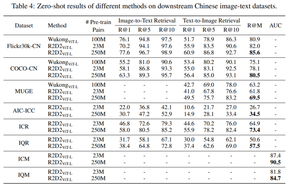 零样本任务。为了证明模型的泛化性能,研究者还进行了零样本迁移实验。从下表 4 中可以看出,与目前 SOTA 性能的 WukongViT-L 相比,R2D2ViT-L(23M)仅使用了不到 1/4 的数据,却在 Flickr30k-CN、COCO-CN 上都取得了更好的性能。当引入 2.5 亿级别的预训练数据时,R2D2 的精度获得进一步提升,相对 WukongViT-L,在 Flickr30k-CN 数据集上,R@M 提升到 85.6%(提升了 4.7%),在 COCO-CN 数据集上,R@M 提升到 80.5%(提升了 5.4%),在 MUGE 数据集上,R@M 提升到 69.5%(提升了 6.3%)。