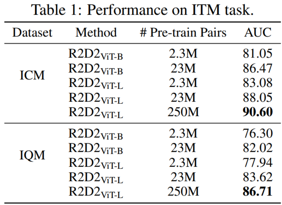 研究者使用了 AUC 作为评价指标。从下表 1 中可以看出,R2D2ViT-L 比 R2D2ViT-B 取得了更好的结果。此外,R2D2ViT-L (23M) 在 ICM 和 IQM 上的表现分别比 R2D2ViT-L (2.3M) 高出约 4.97% 、5.68%。这意味着更多的中文高质量数据能够提高 R2D2 的泛化能力。