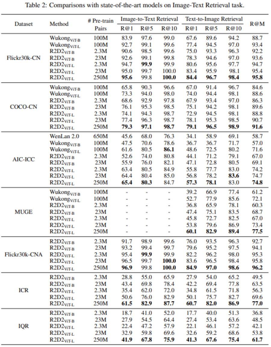 从下表 2 中可以看出,研究者提出的模型在绝大多数任务中都超越了此前的 SOTA,即使仅使用 2.3M 样本(约为 Wukong 数据大小的 2.3%)进行训练时也是如此。对 23M 样本进行预训练时,结果更好。在模型层面,R2D2ViT-L 也在所有数据集中都优于 R2D2ViT-B,表明随着预训练模型变大,算法效果会变好。