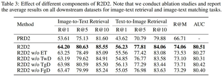 细粒度排序 (FGR) 的效果。首先,研究者使用全局对比预排序(GCPR)和双向蒸馏(TwD)训练模型,并定义为 PRD2。PRD2 的设置类似于 CLIP。从下表 3 的第一行和第二行可以看出,R2D2 在图文检索任务上的表现显著优于 PRD2,可以推测出该结果显著好于 CLIP,这说明了提出的全局对比预排序 + 细粒度排序框架的有效性。